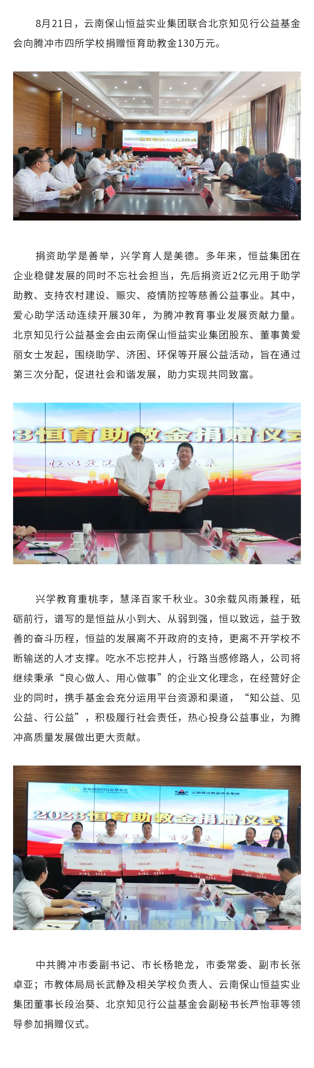 恒益聯(lián)合知見行公益基金會向騰沖市四所學校捐贈130萬元恒育助教金 來源: 瀏覽量:6730 日期:2023-08-21 分享到: 上一篇:沒有了 下一篇:喜訊│恒益集團榮獲捐資助學、尊師重教先進集體(個人)