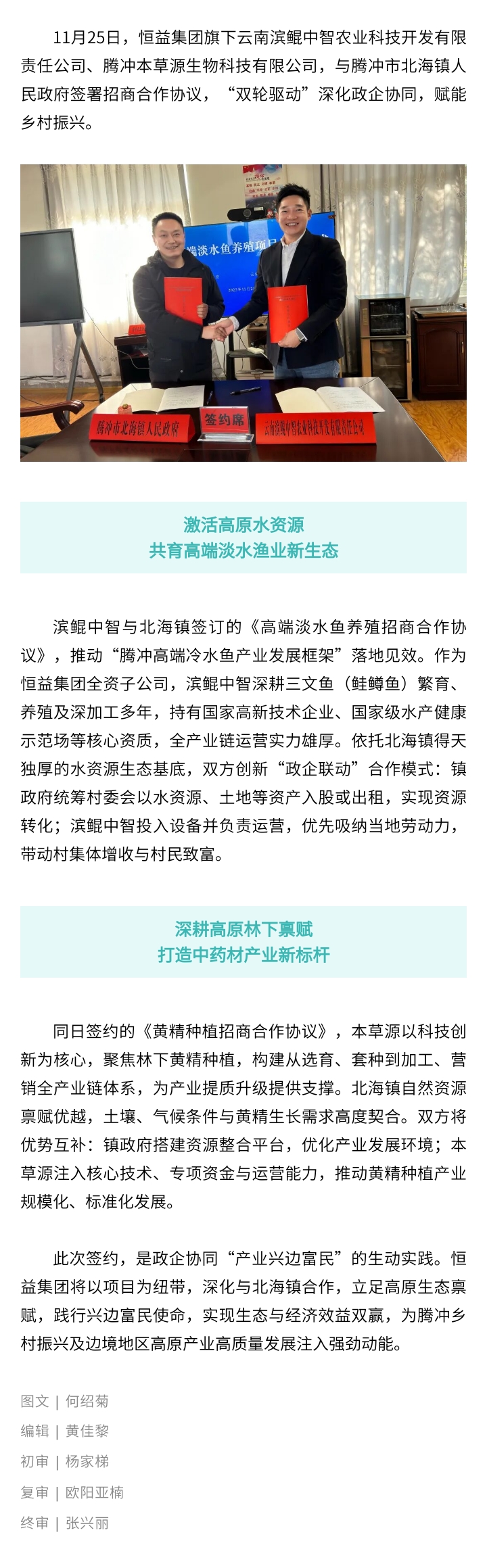 恒益集團雙項目簽約北海鎮(zhèn),政企攜手打造高原農(nóng)業(yè)特色 來源: 瀏覽量:1469 日期:2025-11-25 分享到: 上一篇:溫泉中醫(yī)賦能旅居云南,旅居與醫(yī)康養(yǎng)創(chuàng)新發(fā)展論壇重磅嘉賓及議程公布 下一篇:邀請函 | 2025騰沖科學(xué)家論壇·旅居與醫(yī)康養(yǎng)創(chuàng)新發(fā)展論壇即將盛大啟幕